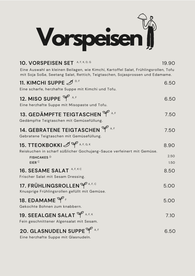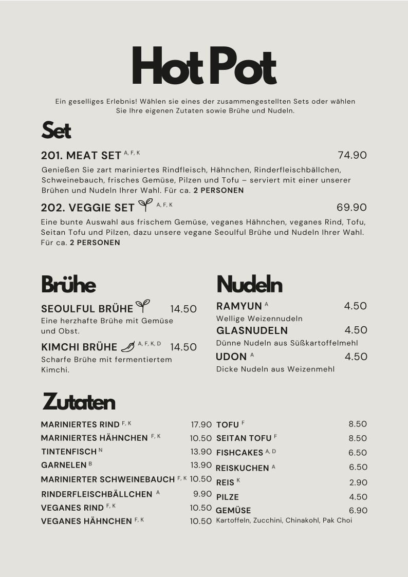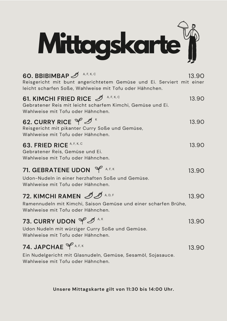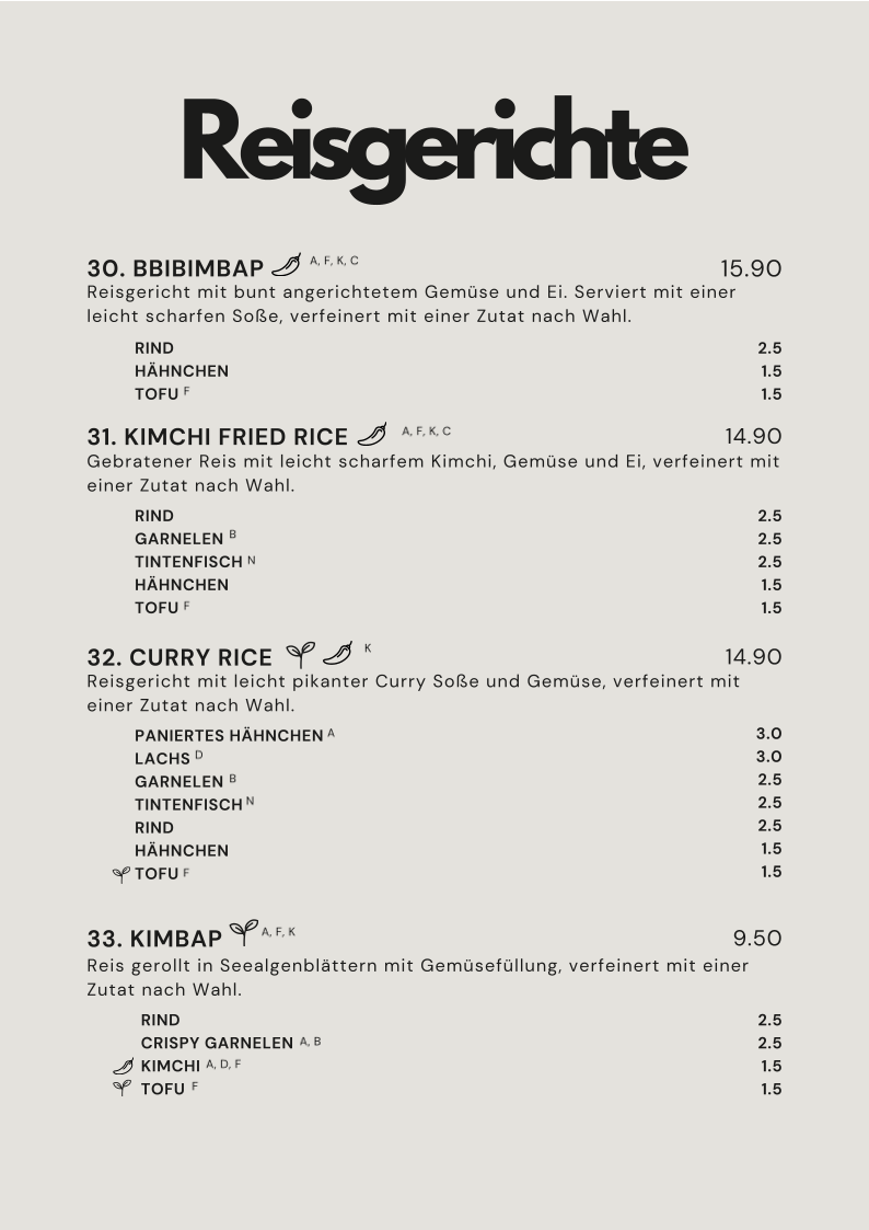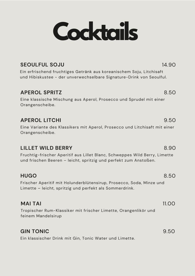 The menu offers a range of Korean-inspired dishes alongside a selection of beverages. It is structured to accommodate various dining occasions, including casual meals and light bites. Visitors can expect options suitable for lunch or dinner.